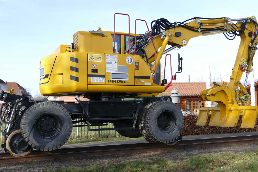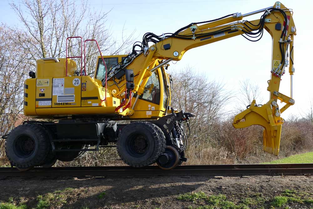 Photo: The new ATLAS 1404 ZW road-rail excavator. Here in use on a narrow-gauge line and with friction wheel drive.