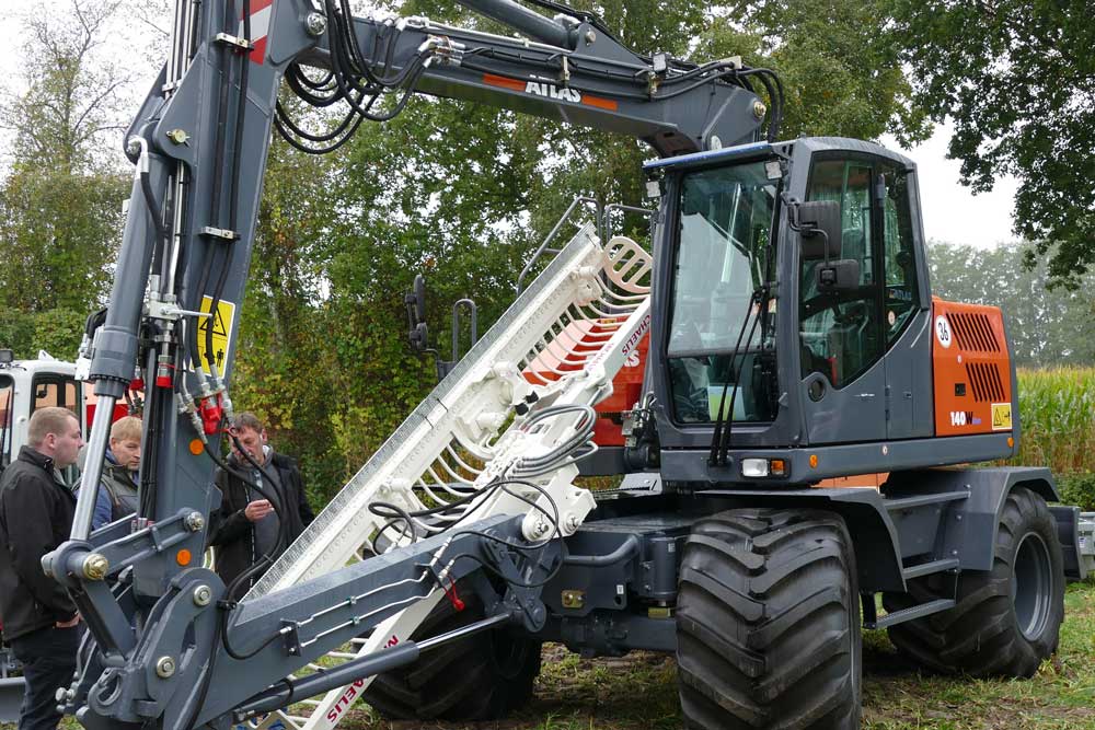 Also on display was a crawler excavator ATLAS 190 LC with 20 t operating weight. The special feature was the equipment for use on heavy or boggy soils. The running gear was equipped with 90 cm 15° floor plates. This gives the best stability even when used in fields and along waterways. An important safety aspect is the excellent all-round visibility from the comfortable cab. In order to be able to work both bank sides of a stream or ditch in one operation, the 190 LC was equipped with two adjustable booms and extension and had 12 m reach. Work was carried out with a 4 m wide mowing basket. It was impressive to see how smoothly and smoothly the 360 bar working pressure of the hydraulics made the ATLAS excavator work. A heavyweight detail also distinguishes the ATLAS excavators. They are equipped with cast steel counterweights. This choice of material reduces the vibrations that an excavator builds up during work. This also caught the eye of the experts on site.