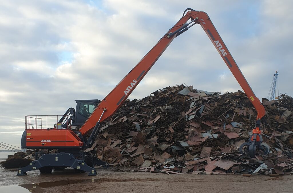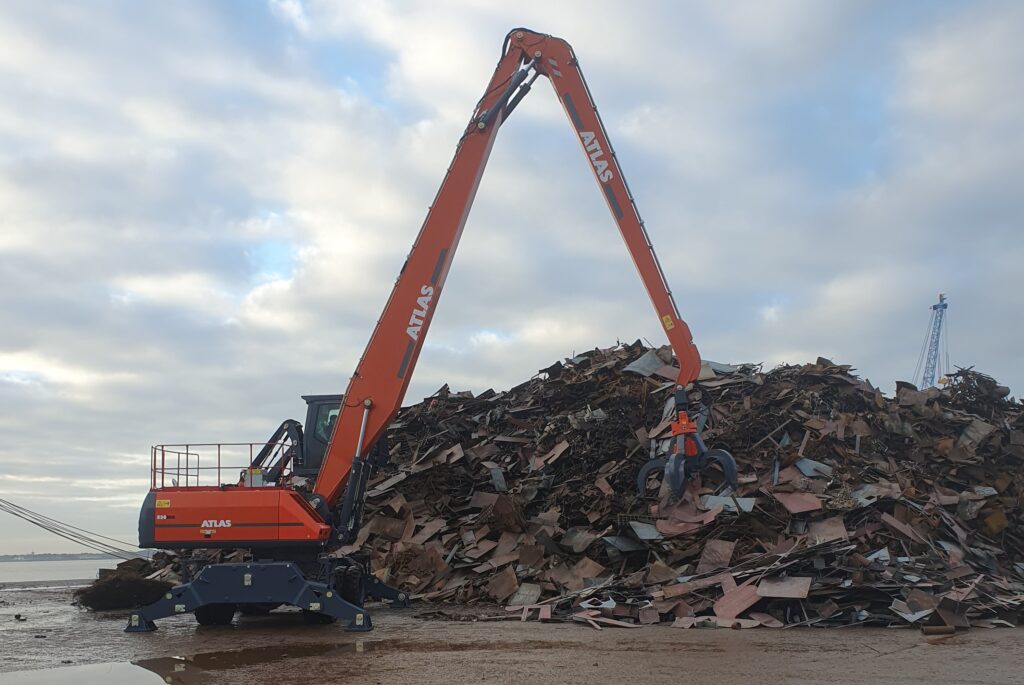 The 57 t ATLAS 520 MH material handling machine loads freight ships with metal – First ATLAS 57 t machine in France – Extremely fast production of the order – Specialist for customised excavators and material handling machines