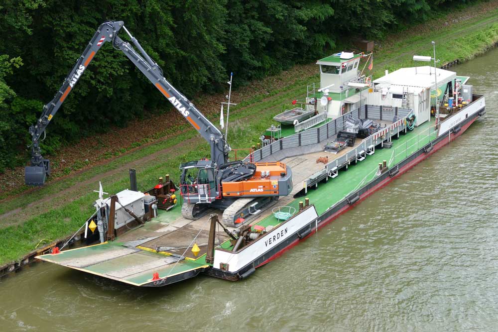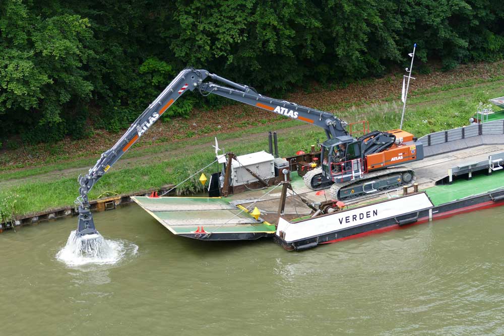 The winner of the tender is the ATLAS excavator 340 LC blue. He prevailed in a tender by the Waterways and Shipping Office for the Mittelland/Elbe Lateral Canal. The 43 t excavator is equipped with a 180 KW/245 hp engine. The boom has a length of 16.3 m and can still lift 4.5 t with an extension of 11.50 m. The 340 LC blue is equipped with numerous attachments for its diverse tasks. These include from ATLAS a clamshell bucket with 800 l capacity, a multi-shell bucket with four grab arms and 900 l capacity, a ditch bucket with 2,200 mm width and 1,000 l capacity and a load hook that can carry up to 8 tonnes. The hydraulic system is filled with bio-oil and equipped with a bypass filter system.