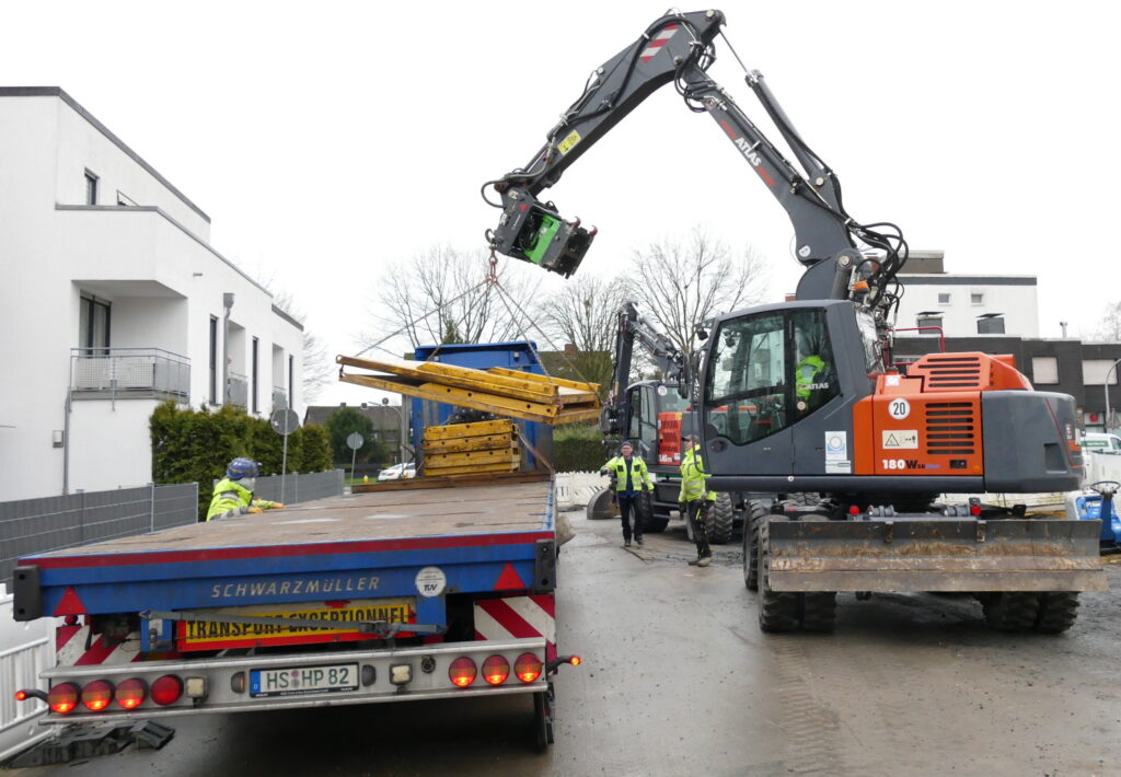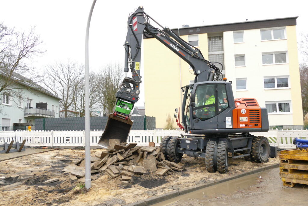 The company Stefan Gockeln is at work in Datteln. On a stretch of 50 m in a residential area, the sewer system with supply and drain line as well as the street and a pedestrian walkway had to be newly built. This range of assignments is Gockelns specialty. The company, which is in its fourth generation, and its 30 employees, are utilized to their fullest capacity due to a positive order situation. The ATLAS wheeled excavator (plus another ATLAS 175 WSR) is an indispensable technical assistance in this situation.