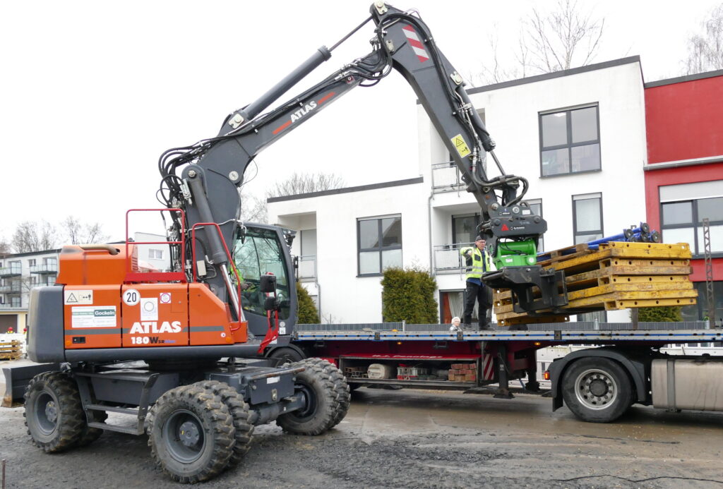 The undercarriage of the 180 WSR is 2,750 mm wide and therefore a solid base for handling heavy loads. The ATLAS wheeled excavator is stable and sturdy enough to move loads of about 4 t with an overhang of 7.5 m. It can also lift and move heavier loads of 10 or even 13 t. It really is something else to witness how rock-solid the 180 WSR stays on the ground with all four wheels and moves its loads. One reason for the stable foundation surely are the especially wide 215/70 R22.5 Caliber Power Grip 23 tires. Gockeln says: “The 180 WRS is not only quick at digging. We’re always surprised to see how effortless it transports even the heaviest construction elements.”